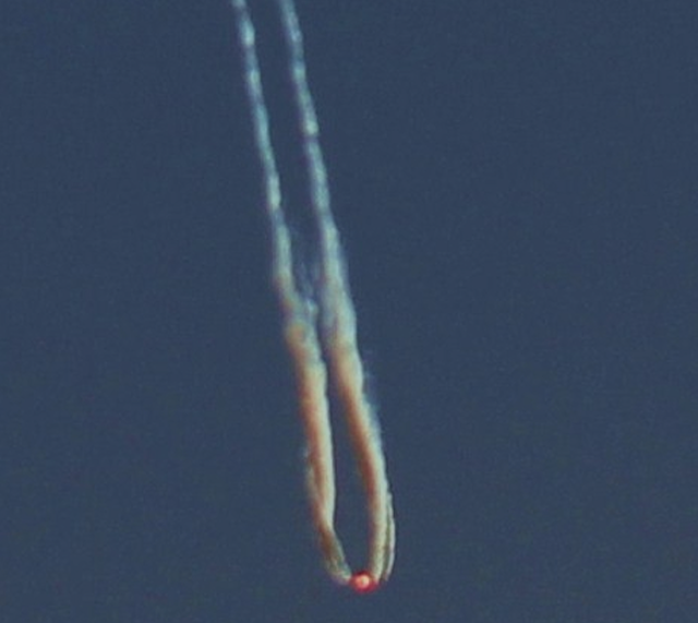 При таком качестве съемки хорошо виден след, он практически не меняется, нет его увеличения или изменения, он как бы завис, не видно ни одной части лайнера.